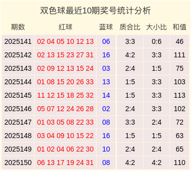 双色球2025150期开奖,本期奖号:红球06、13、17、19、24、31,蓝球08。其中红球奖号质合比为4:2,大小比为4:2,和值为110。