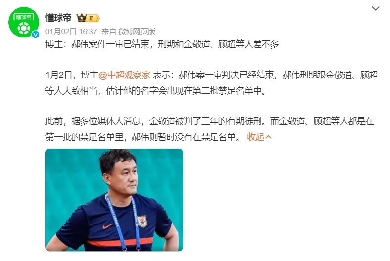 据官方媒体《懂球帝》报说念,前中国女足主评释、前中超山东泰山俱乐部主评释郝伟一审判决也曾限度,最终他的刑期与金敬说念、顾超级东说念主大要相配,况兼随后郝伟的名字应该会出目下第二批禁足名单当中,此前山东泰山俱乐部球员金敬说念被判了三年的有期徒刑,并出目下了第一批禁足名单中体育集锦,是以郝伟的刑期应该亦然3年,由于郝伟曾在2013年担任过中国女足国度队的主评释,是以他亦然继李铁之后,第二位被宣判的前国足主评释