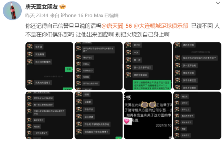 不久前,一个账号为“唐天翼女一又友”的网友再次爆料更多对于唐天翼的猛料,其晒出了好多张聊天纪录的截屏图片。此外,这位所谓的“唐天翼女一又友”还艾特了唐天翼本东谈主的账号,以及大连鲲城足球俱乐部的官方账号,直言:你还谨记我方信誓旦旦说的话吗?已读不回,东谈主不是在你们俱乐部吗?让他出来恢复啊!别把火烧到我方身上啊!