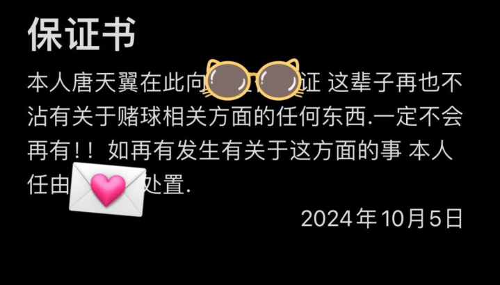 通过这个网友晒出的聊天纪录可以看到两个方面的实质。第一,疑似唐天翼的戒赌保文凭。有一份保文凭上写着:本东谈主唐天翼在此向XXX保证,这辈子再也不沾关连于赌球联系方面的任何东西。一定不会再有!若是再有发生关连于这方面的事,本东谈主任由XXX贬责。第二,疑似唐天翼承认我方和女方有了孩子。在聊天纪录中,疑似男方说“不会害你和宝宝”。